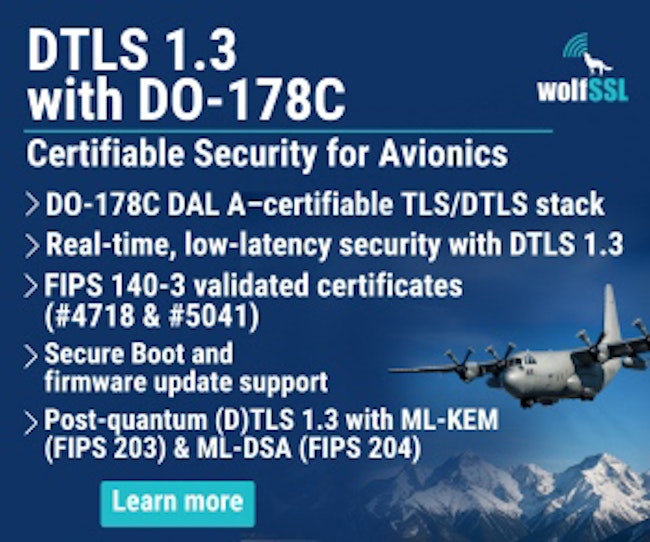 | | Sponsored | | wolfSSL delivers certifiable DTLS 1.3 designed for DO-178C DAL A avionics systems. Built on FIPS 140-3 validated certs (#4718 & #5041), it provides authenticated, encrypted communication between safety-critical components. With wolfBoot secure boot and firmware update support, and post-quantum (D)TLS 1.3 using ML-KEM (FIPS 203) and ML-DSA (FIPS 204), wolfSSL meets mission-assurance requirements. |