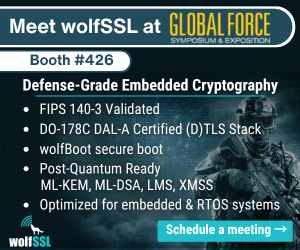 | | Sponsored | | wolfSSL is trusted by the U.S. military. Our FIPS 140-3 & DO-178C DAL-A certified cryptography secures mission-critical communications and weapon systems. We provide 100% USA-made embedded cryptographic libraries, including wolfBoot secure boot. We also support post-quantum cryptography for aerospace and defense. Visit us at the AUSA Global Force Symposium & Exposition, Booth 426. |